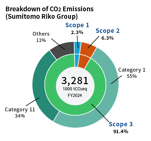 The Sumitomo Riko Group is committed to achieving carbon neutrality by 2050. To this end, we are not only reducing GHG emissions from our own business activities (Scope 1 and 2) but also working to minimize emissions across our entire value chain (Scope 3), which includes the procurement of raw materials as well as the use and disposal of our products.